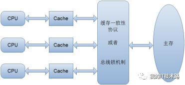 由于cpu的执行速度远远大于IO的速度,为了减少和IO的交互,增高效率,cpu内部会有高速缓存(cache)。当程序运行的时候,高速缓存中会从主存中保存一份副本数据。每次读写都在高速缓存中操作,这个在单线程下是没有问题的,但是多线程下会导致数据不一致的情况(其他线程中的数据没有同步该线程修改的数据)。为了解决这个问题(其实就是上图中可见性描述),通常有两种方案进行解决:锁和缓存一致性协议。由于在总线上加锁的机制导致效率低下,所以缓存一致性协议就变得关键了。具体原理是:当CPU写数据时,如果发现操作的变量是共享变量,即在其他CPU中也存在该变量的副本,会发出信号通知其他CPU将该变量的缓存行置为无效状态,因此当其他CPU需要读取这个变量时,发现自己缓存中缓存该变量的缓存行是无效的,那么它就会从内存重新读取。