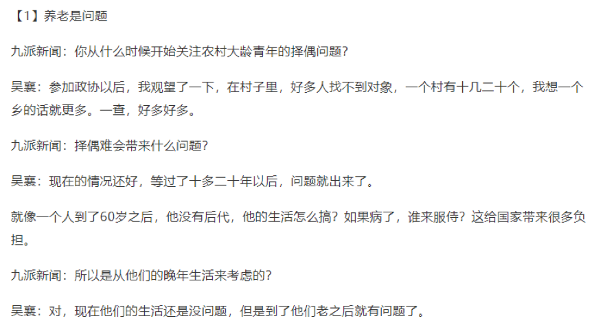据九派新闻联系吴襄的采访显示,吴襄是担心村里大龄单身青年养老问题,担心没有人“服侍”。