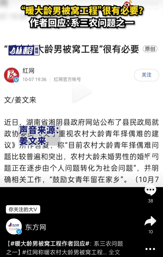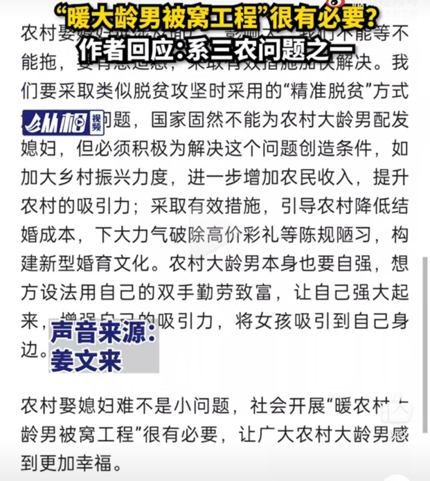 简单说,就是一个人看到大龄单身男青年没结婚,想到他们没人养老,这是个社会大问题,于是提出建议,县政府表示赞同,致力于破除高价彩礼等问题,鼓励女青年留在家乡。而某高级知识分子认为,发文评论“暖被窝工程”很有必要。(根据截图所得结论)