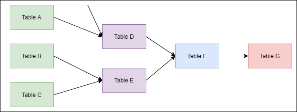 而有了数据中台之后就不需要那么繁琐,直接进行数仓搭建,产生报表即可,无需将精力过多放在数据源、可视化展示及调度。并且可以直观的查看数据血缘关系,计算表之间血缘。像下面图中,表之间的依赖关系很明确: