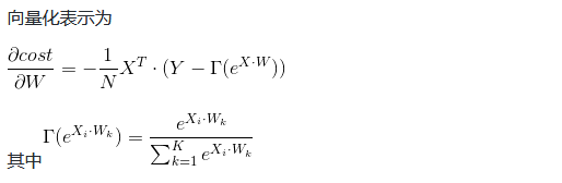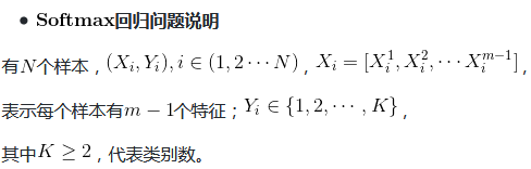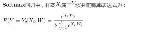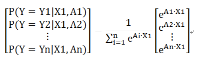 不同于逻辑回归,Softmax回归定义一条数据X1属于类别Yi的概率为P(Y=Yi|X1,Ai),其中Ai代表类别Yi的超平面参数,表达式如下: