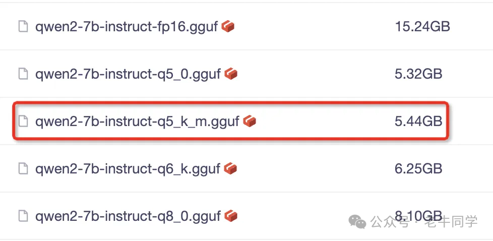 打开Qwen2-7B-Instruct-GGUF模型文件列表(https://modelscope.cn/models/qwen/Qwen2-7B-Instruct-GGUF/files),我们选择qwen2-7b-instruct-q5_k_m.gguf并下载: