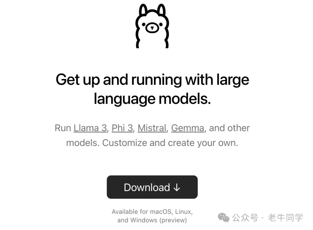 Ollama提供了MacOS、Linux和Windows操作系统的安装包,大家可根据自己的操作系统,下载安装即可: