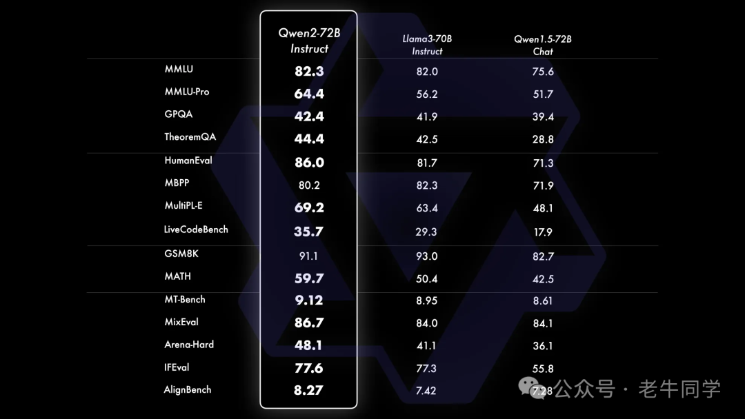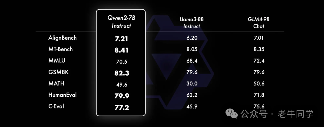 老牛同学今天部署和体验Qwen2-7B-Instruct指令微调的中等尺寸模型,相比近期推出同等规模的开源最好的Llama3-8B、GLM4-9B等模型,Qwen2-7B-Instruct依然能在多个评测上取得显著的优势,尤其是代码及中文理解上。