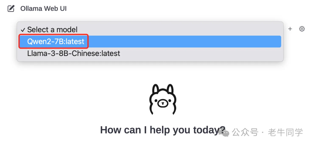 可以看到Ollama的初始化页面,默认没有模型,需要选择,我们选择刚创建并部署的Qwen2-7B模型: