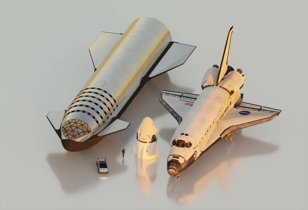 星舰飞船(左)与航天飞机(右)和载人龙飞船(中)的对比 | Dale Rutherford