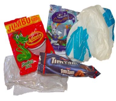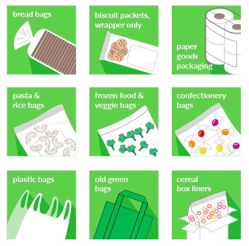 比如吐司包装袋、饼干外包装袋、意面和大米的包装袋、冷冻食品包装袋、糖果零食包装袋、麦片包装袋、卷纸外面的一层塑料膜,以及塑料购物袋等等。