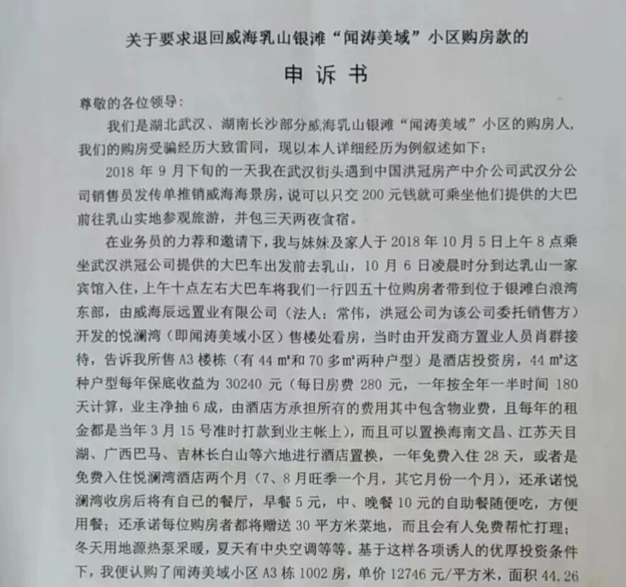 退房失败后,张凤兰回到武汉,开始联系跟她一样被骗的老人,计划一起维权。她写了一份揭露银滩开发商虚假宣传的申诉书,武汉有38位老人签字,长沙有39人签字。申诉书被寄到威海、济南、北京等城市的各个部门,共发了11份。