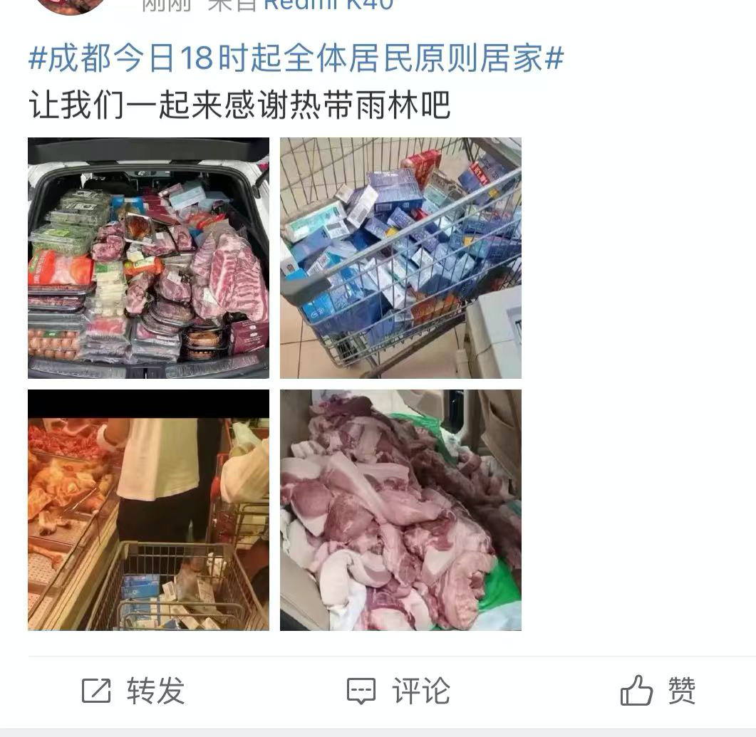 比如你看,当今天成都要求居家的通知出来的时候,一堆人都跑去抢菜了: