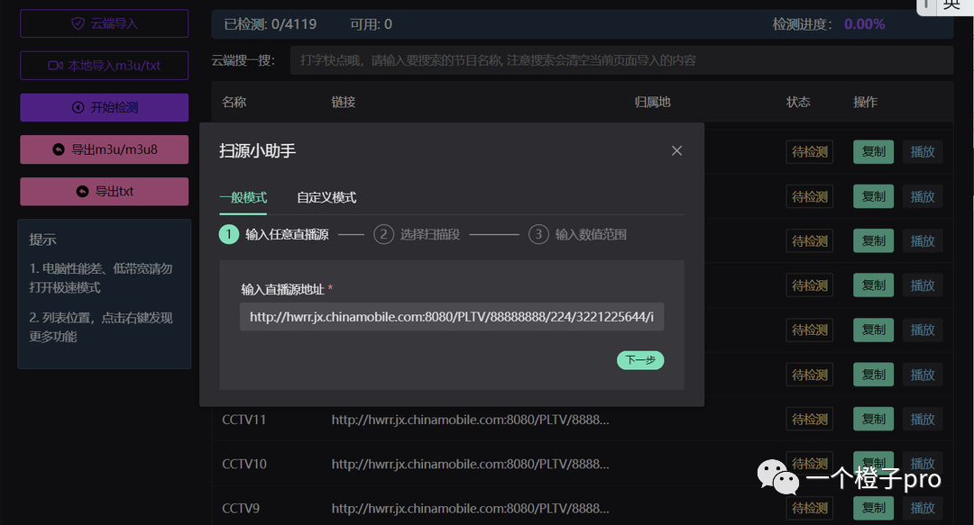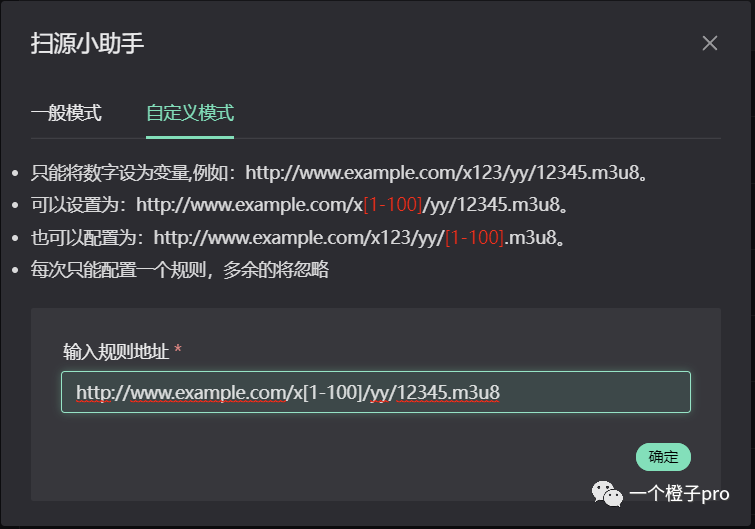 自定义模式相对高级一点,不是所有的直播源地址都那么规整。就需要借助自定义模式了。http://www.example.com/x123/yy/12345.m3u8我们需要扫描 x1 - x100 段的怎么做呢。直接输入框内输入http://www.example.com/x[1-100]/yy/12345.m3u8