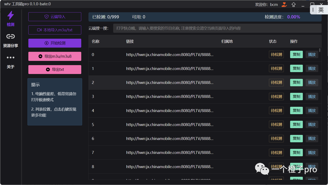 最后点击完成,源检测的列表里面就出现了需要验证的,直播源是不是很简单呢。此时,点击右侧开始检测就行了。
