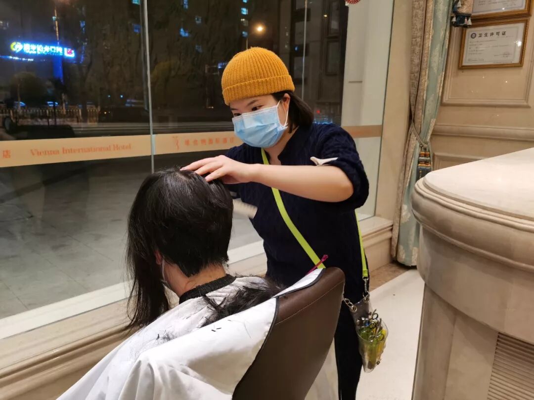 “我们把酒店大堂当作理发厅,有些酒店大堂没有镜子,我们就对着大堂玻璃门当镜子,战时状态嘛。”文彬说。