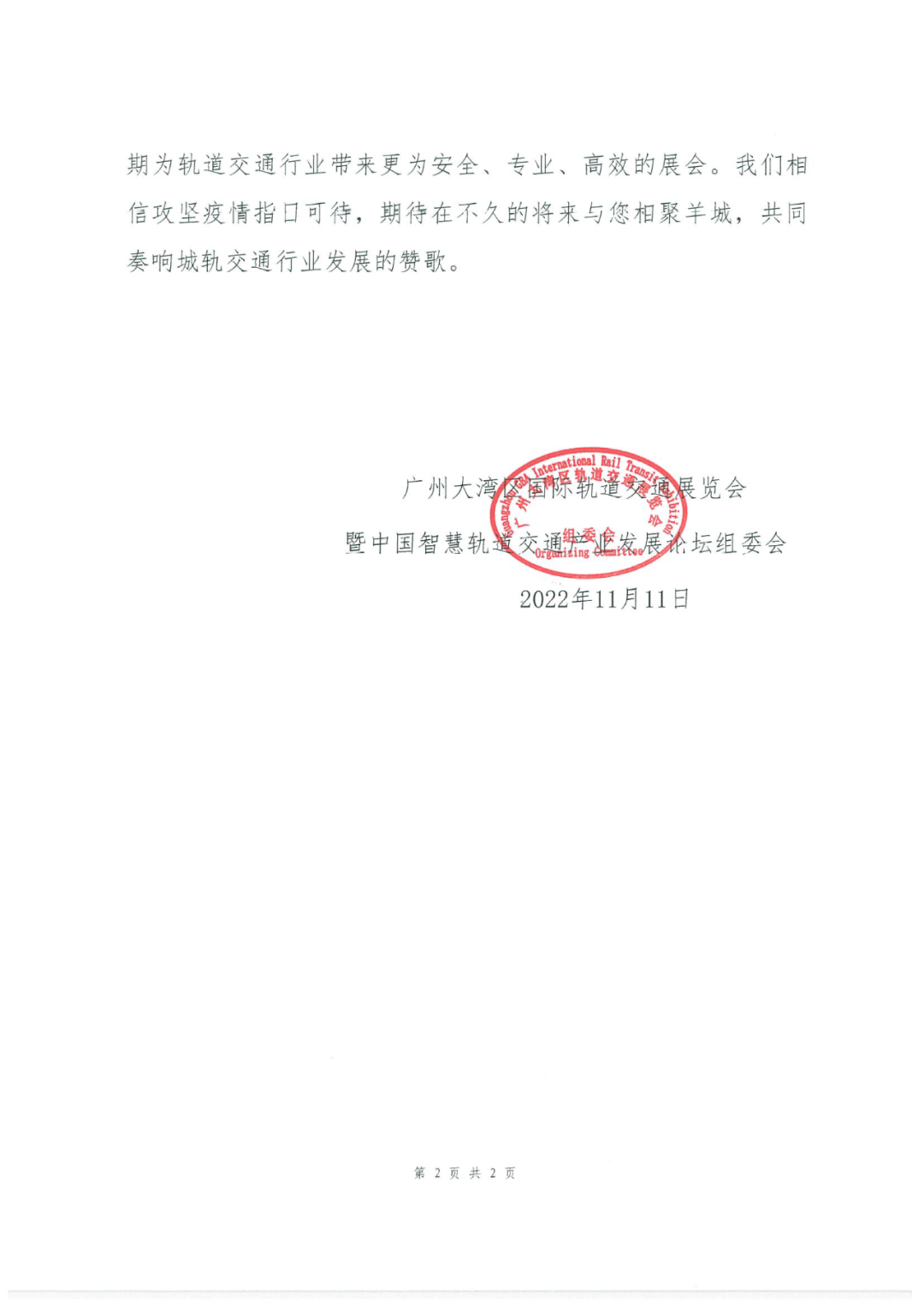 鉴于近期广州及全国部分地区疫情反复,原定于2022年12月1日-3日举办的“2022(首届)广州大湾区国际轨道交通展览会暨中国智慧轨道交通产业发展论坛”“第二届中国城市轨道交通装备自主创新成果展示会”(以下简称“广州大湾区轨道交通展”)将延期举办,具体时间另行通知。
