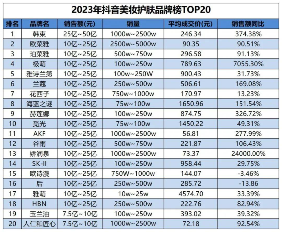 2023年抖音美妆护肤品榜TOP20榜单