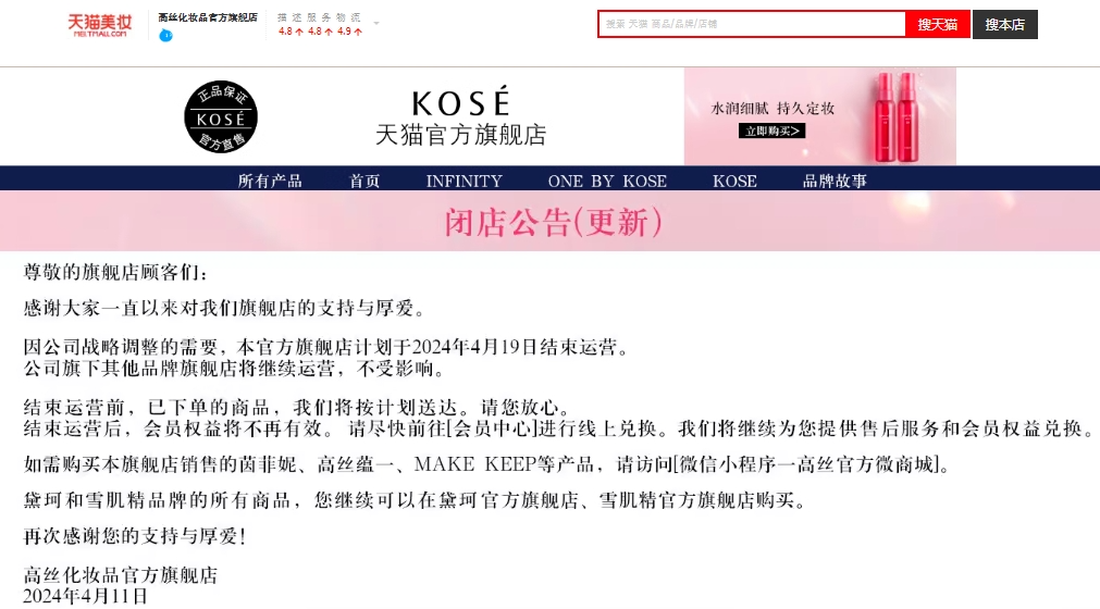 明天,日本知名化妆品高丝,即将关闭经营14年之久的天猫店铺。