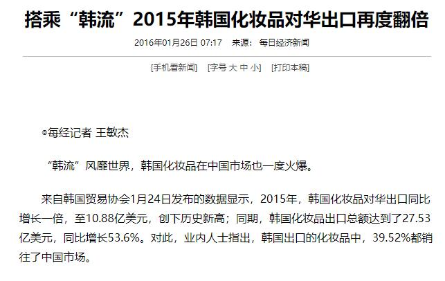 2015年,韩国化妆品对华出口同比增长一倍,至10.88亿美元,创下历史新高。