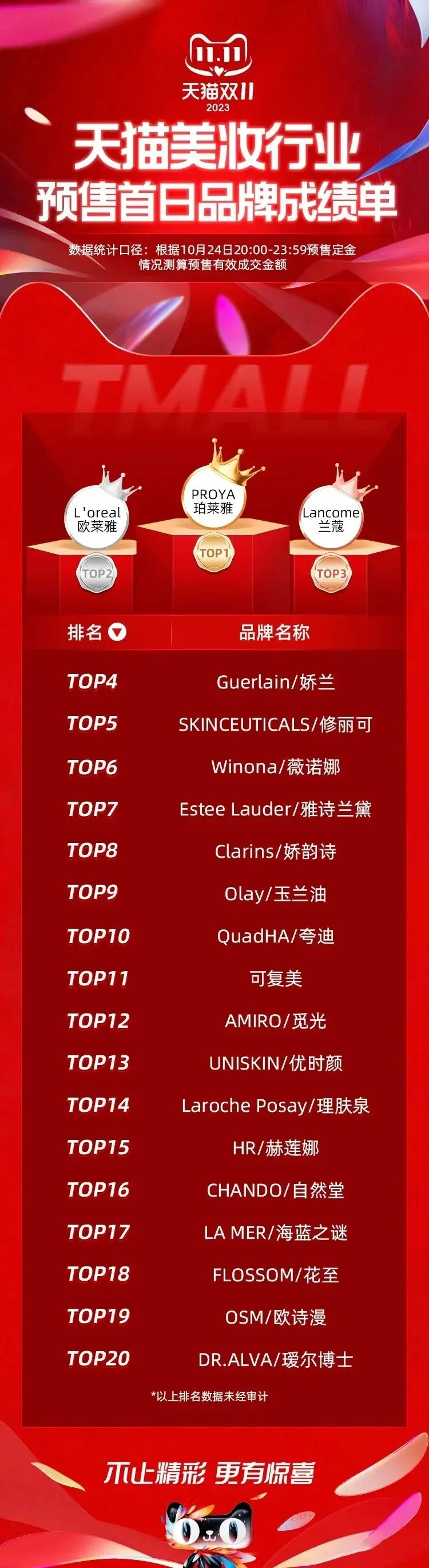 据“天猫大化妆品”发布的《天猫化妆品行业预售首日品牌成绩单》显示,2023年双十一期间,TOP20品牌中有60%为外资品牌。