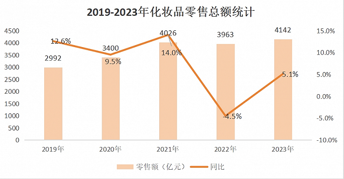 从历年数据看,2019年,中国化妆品零售额为2992亿元,2023年,增长至4142亿元。