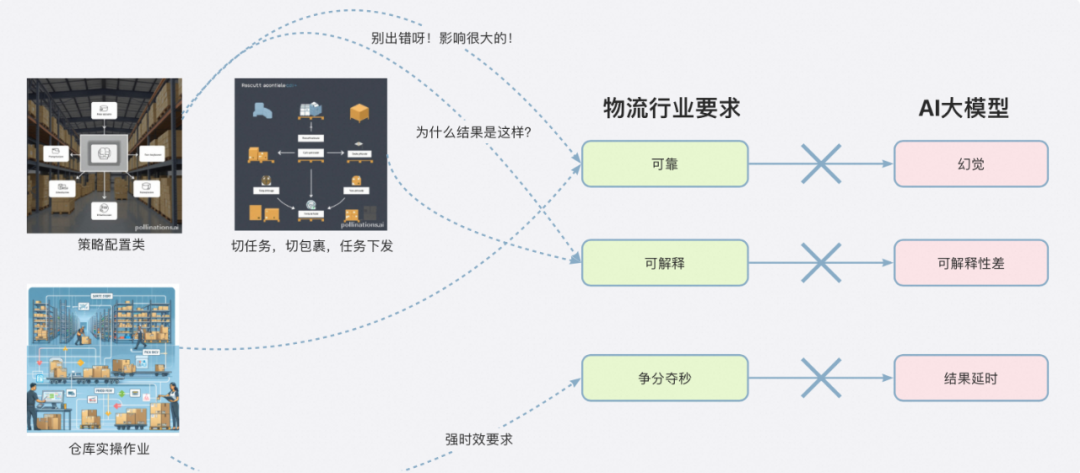 当前大模型的应用还是处于比较初期的阶段,以物流领域常见场景为例,可以看到一些行业常见要求和当前大模型能力有较多冲突,在这些业务生产环境应用之前,我们还是希望先在容错性较高的场景进行一些实践。因此我们尝试基于大模型来优化答疑机器人,为后续更多的深度应用积累实践经验。(下面的示例图片由大模型生成,仅供参考)