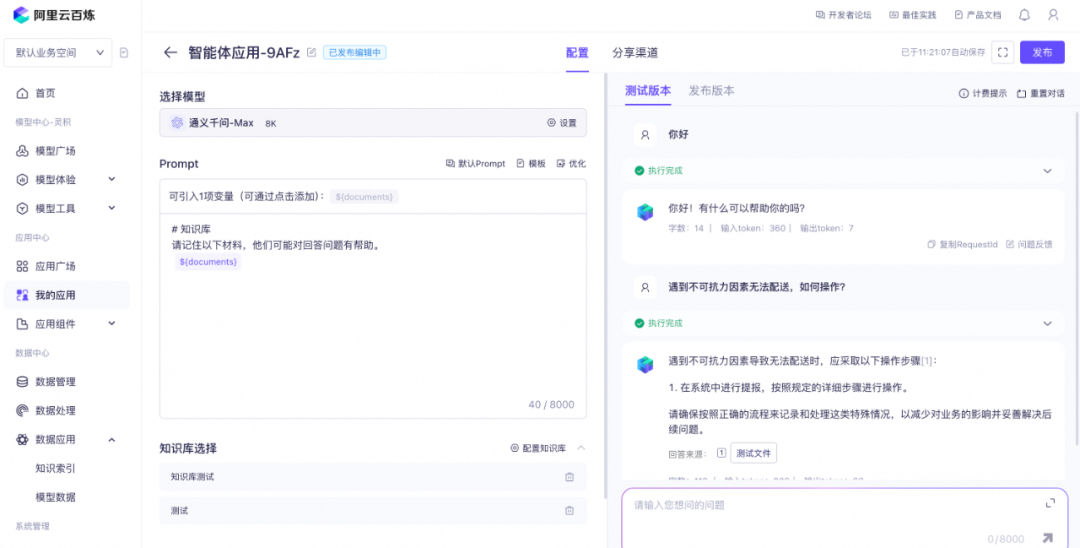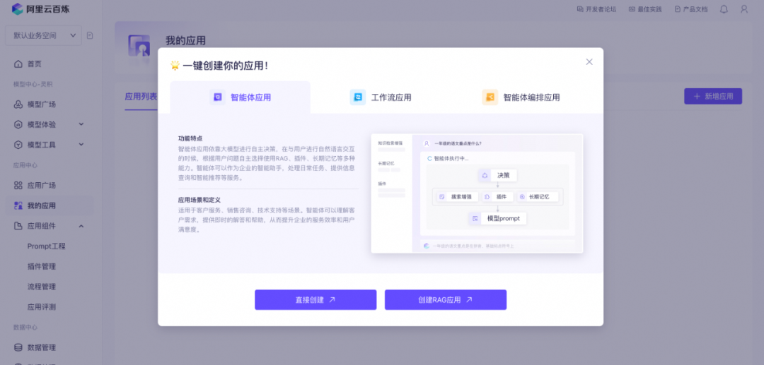 平台对应的文档中心有详细的实践教程,在准备好基础文档的前提下,基本五分钟就可以搭出来一个智能体应用。以下用一个简单的示例演示下RAG流程和需要关注的点(以下相关截图来源阿里云百炼平台):