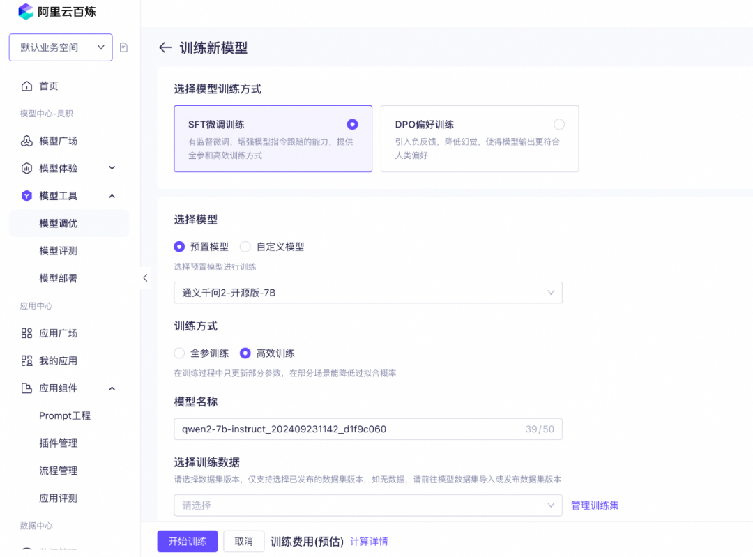 目前模型微调平台也有很多,这里使用阿里云百炼平台简单展示下核心步骤。(以下截图来源阿里云百炼平台)