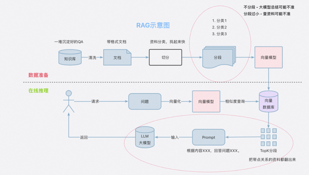 1. 在数据准备阶段,这里的原始数据可能是大量的文档资料,我们需要尽量清洗为统一格式的文档,每个文档都按照一定的规则进行分段。这里的分段规则和大小需要多次尝试,来保证最终的检索速度和总结效果。然后把分段后的知识向量化,存入向量数据库。