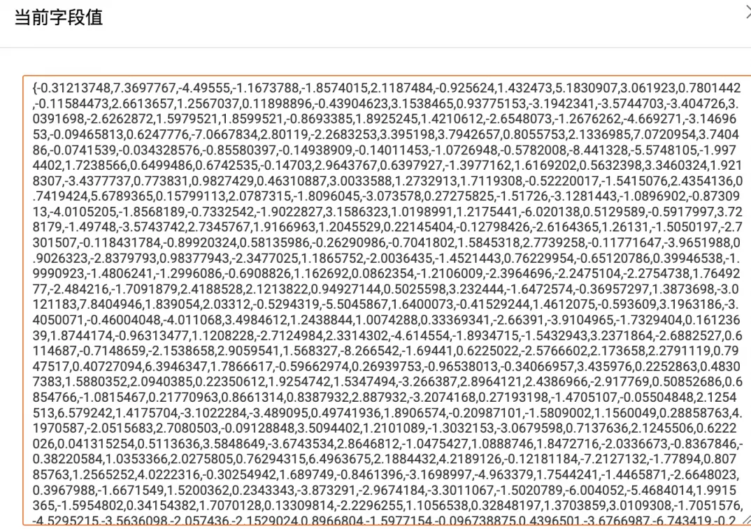 可以看到一端文本转为向量存在向量数据库中的字段展示,根据不同的Embedding模型维度也有不同,通常达到上千维。