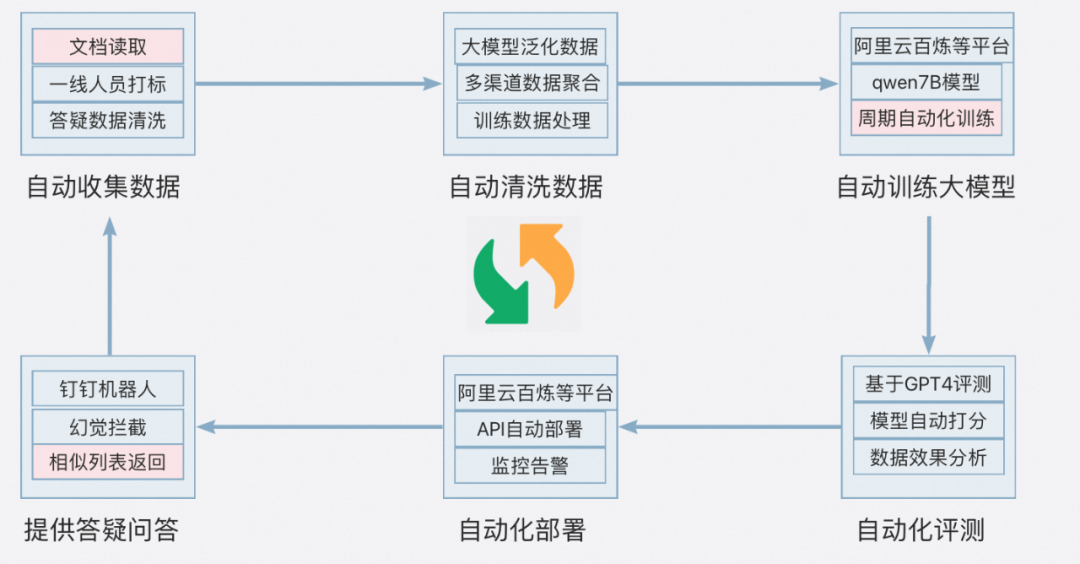 2.【自我迭代】数据清洗,模型训练部署等环节通过工程自动化实现模型的自我学习能力(大模型在快速发展,我们需要有快速微调模型并切换的能力,而且未来成本一定会降低)。