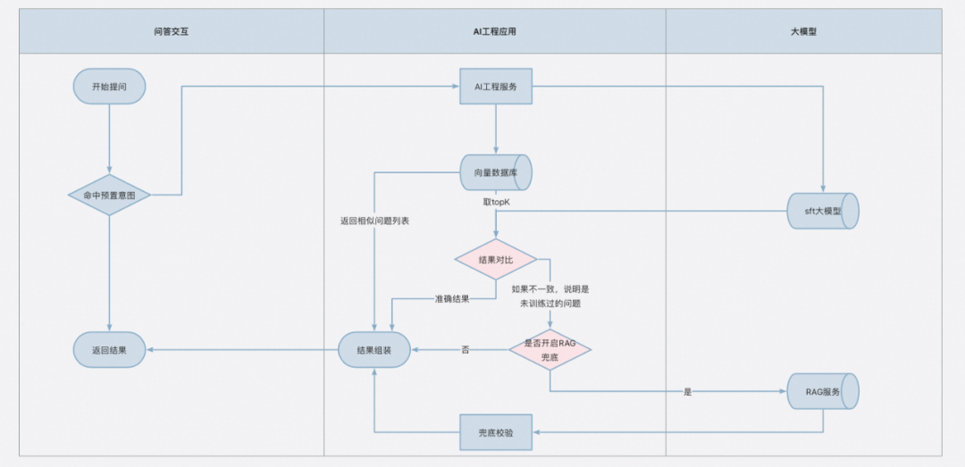 于是有了让 向量搜索,RAG,SFT 各司其职来实现更好问答效果的实践,以下是一次问答的简化版本的流程图: