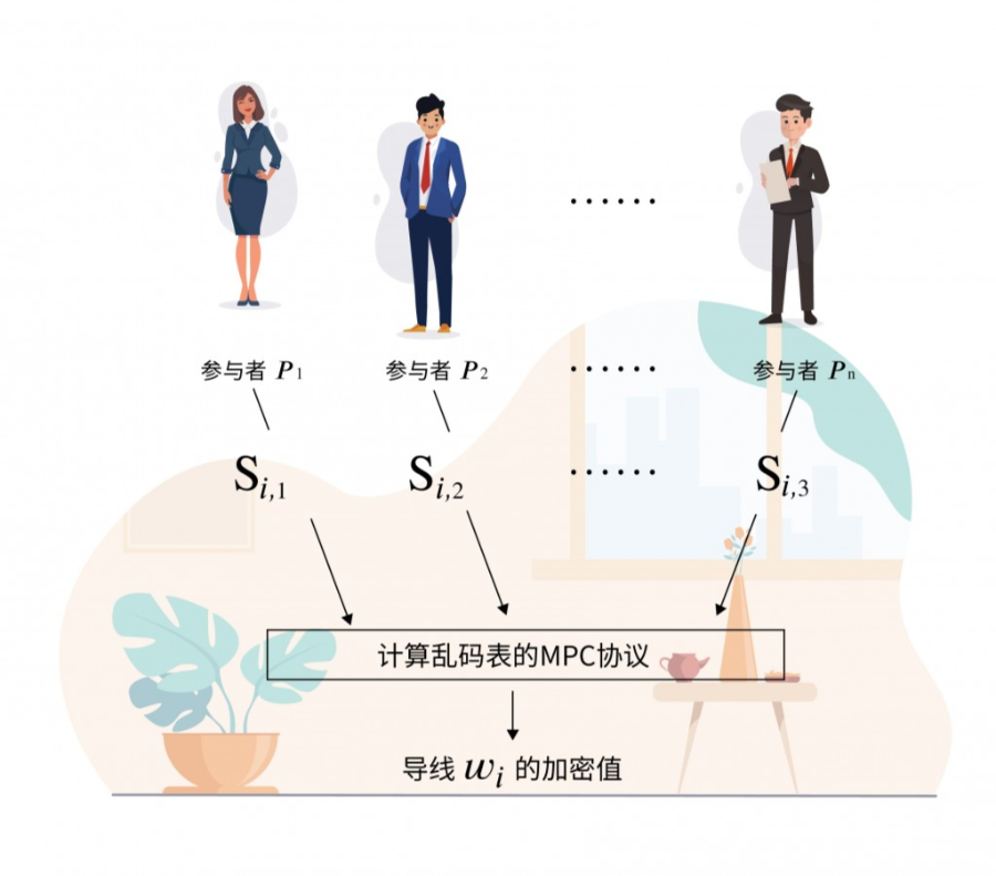 对于布尔电路𝒞中的每一个门𝐺𝑖,所有参与者共同参与一个计算乱码表的多方安全计算协议。该协议的输入是每个参与者之前计算的𝑆𝑖,𝑗和参与者的输入 𝑥1,𝑥2,…,𝑥𝑛。该协议的目标为: