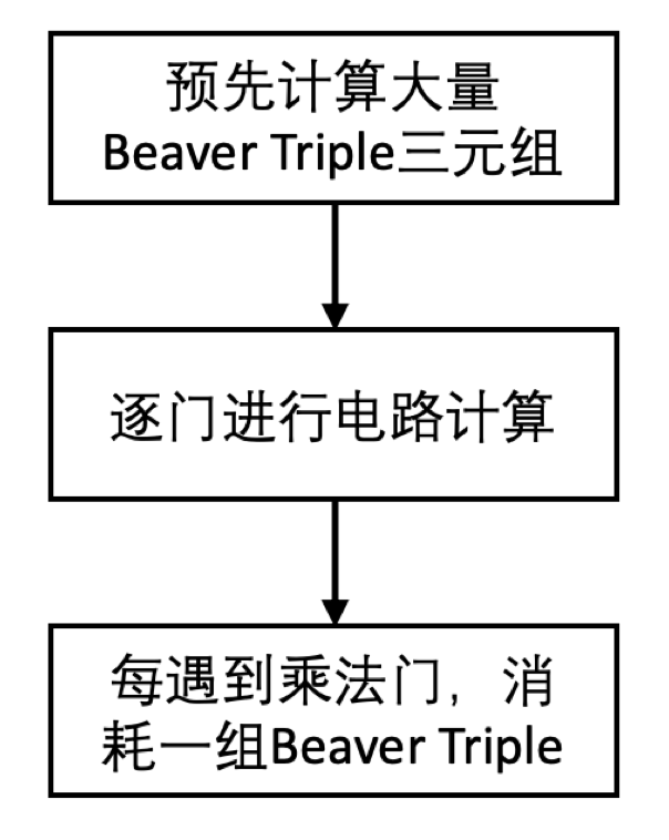 Beaver三元组是消耗性,每次乘法计算都会消耗一个Beaver三元组,通过预先计算的Beaver三元组,将通信量和计算量移到了协议开始之前。