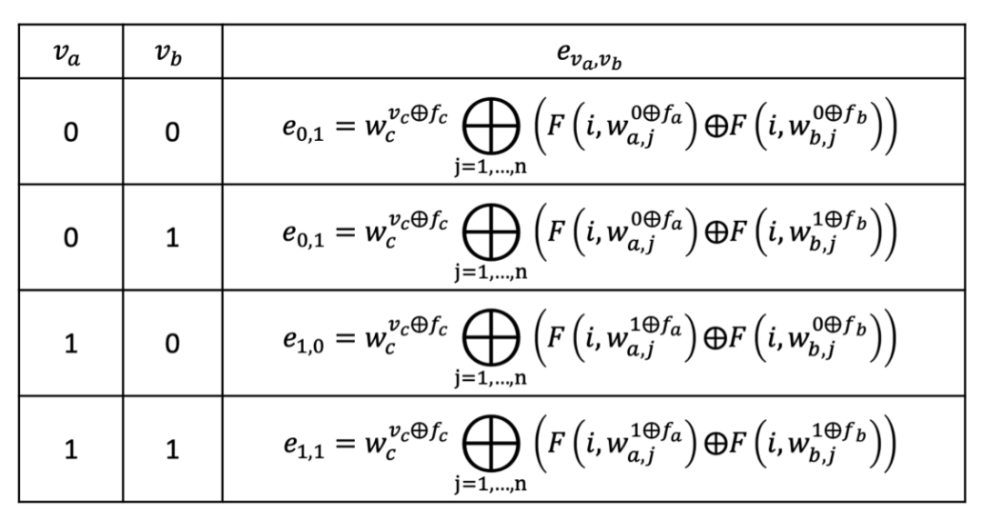 接着创建门𝐺𝑖的乱码表,让𝑣𝑎, 𝑣𝑏分别是导线𝑤𝑎, 𝑤𝑏, 的输入,对于𝐺𝑖输入𝑣𝑎,𝑣𝑏∈{0,1},一共只有四种可能的组合。