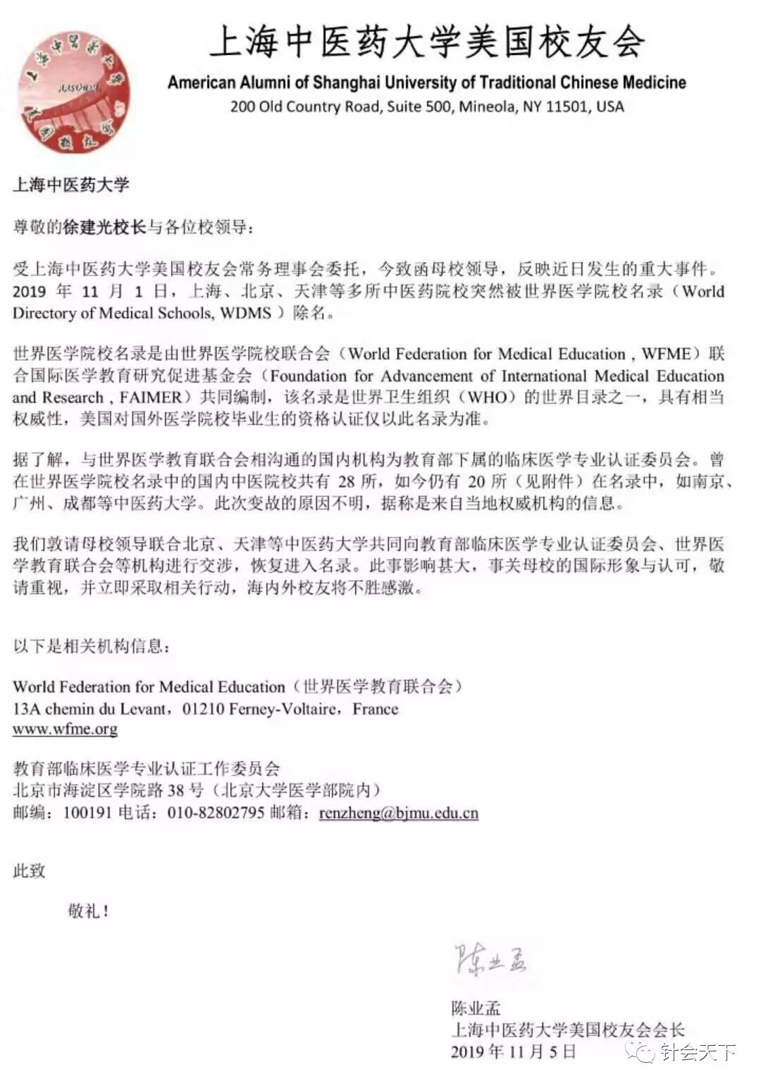 北中医校友会、上海中医药大学美国校友会发布声明,证实了此事