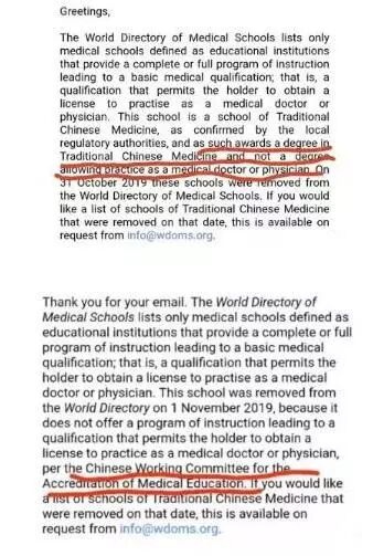 经了解,过去世界卫生组织(WHO)在管理《世界医学院校名录》(WDMS)时,把传统医学院校(中医院校)与西医院校并列。然而,WFME在接管WDMS后,对此做法改变了,即现在WDMS只收录开办西医临床医学专业医学院校,而不把中医等传统医学列入此名录。但是,这并不表明世界卫生组织不承认只开办中医临床专业中医院校的医学院校地位。