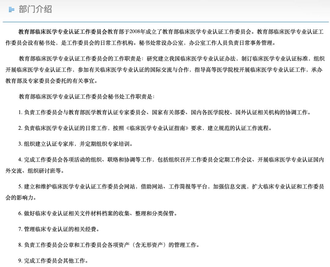 教育部临床医学专业认证工作委员会教育部于2008年成立了教育部临床医学专业认证工作委员会。教育部临床医学专业认证工作委员会设有秘书处,是工作委员会的日常工作机构。秘书处常设办公室,办公室工作人员负责日常事务管理。