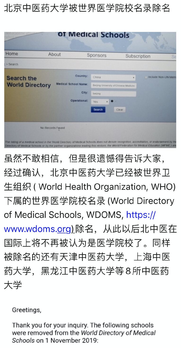 2019年11月1日,由世界卫生组织(WHO)管理的 世界医学教育协会(World Federation for Medical Education, WFME) 将8所中国的中医药大学从世界医学院校名录(The World Directory of Medical Schools, WDoMS)中删除。他们分别是: