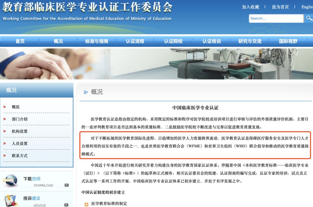 对于不断拓展的医学教育国际化进程、日趋增加的医学人力资源跨界流动,医学教育认证是保障医疗服务安全及医学专门人才合理利用的切实有效的手段之一,也是世界医学教育联合会(WFME)和世界卫生组织(WHO)联合倡导和推动的医学教育质量保障模式。