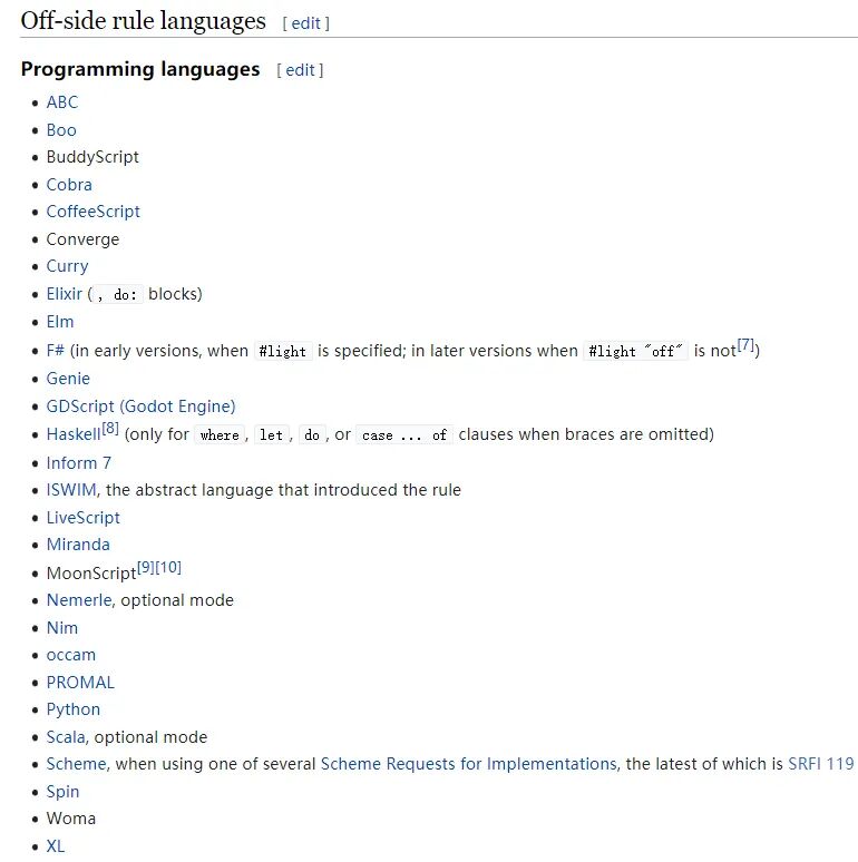如今 2022 年即将过去,Python 已经度过了它的“而立之年”, 受这种设计思想影响的编程语言也遍地开花:据维基百科统计,有近 30 门语言使用“Off-side rule”。