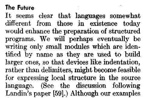 从 1965 年的 ISWIM,到 1974 年唐纳德的畅想,再到 1975 年 P.J. Plauger 激进的想法,再到 1980 年代 ABC 及 Python 的落地实现。20 多年的时间,说长确实是挺长了。
