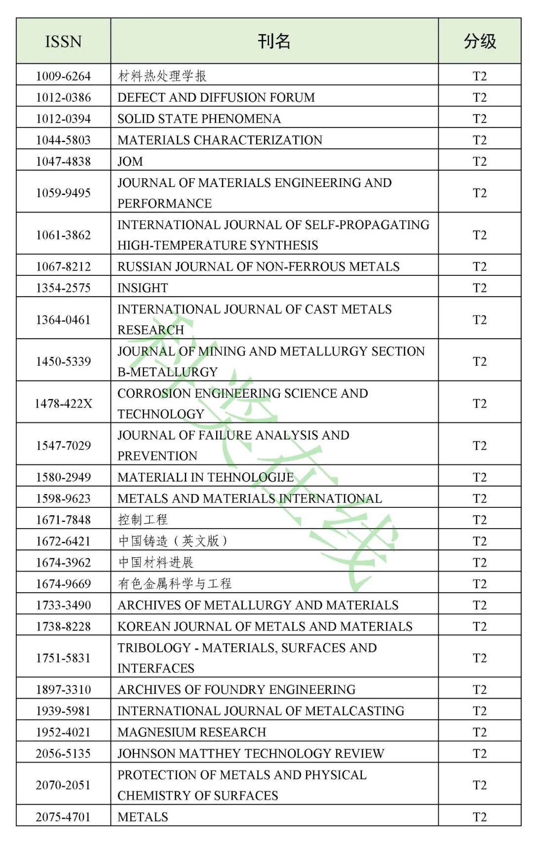 14.冶金工程技术与金属材料(金属学与金属工艺)领域高质量科技期刊分级目录(共136种)