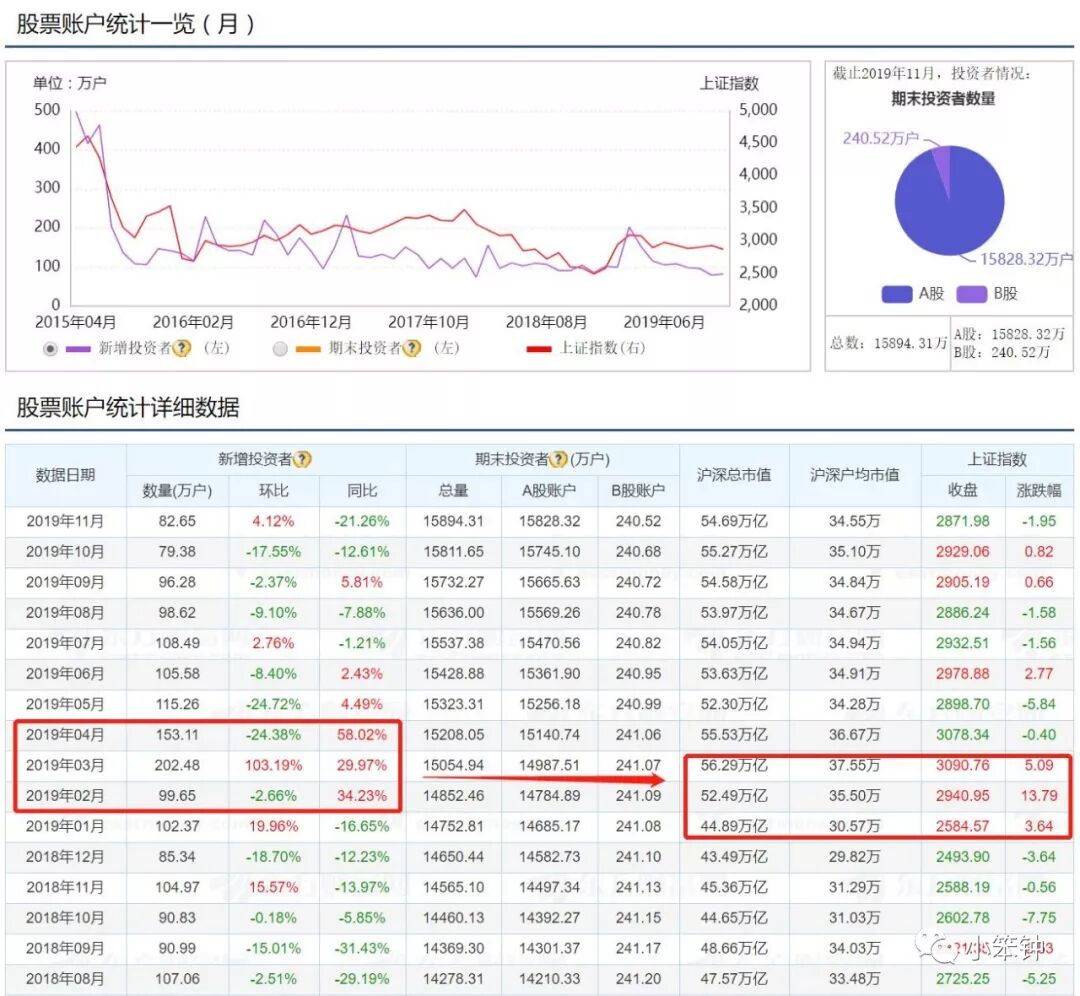 仔细看这张图,红框的数据充分显示了指数的上涨和新增投资者数量的相辅相成的关系。然后从他们的数据涨幅有一个月的间隔来看,一波新鲜的韭菜完成了收割。