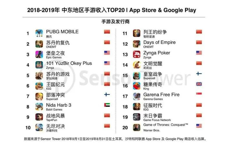 确实很大一部分是真的,其实中国游戏公司在中东市场“乱杀”已经有挺长一段时间了。网龙的《征服》在09年就打入了阿拉伯市场;龙腾简合的手游《苏丹的复仇》,常年位于中东地区下载榜单前五。这种榜单上,一半游戏都是中国制造,最近榜首更是一直被腾讯的《PUBG:Mobile》霸着。