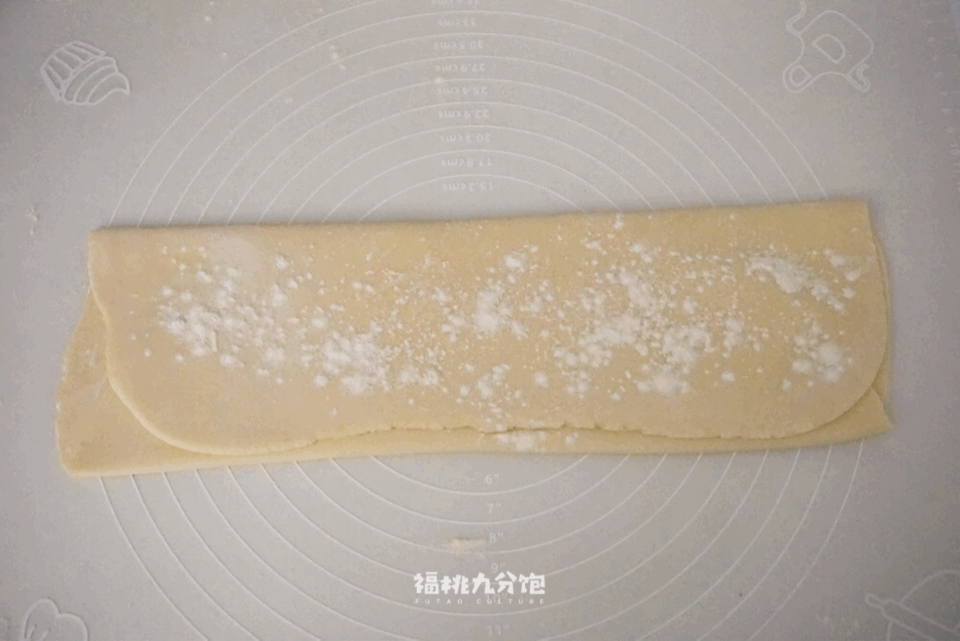 把准备好的干面粉撒在面片上,对折面片后再撒,再对折再撒,最后第三次把干面粉对折进面片里。