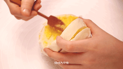 2.将奶酥酱厚涂上一层。但也不能太过贪心,不然会造成馒头水分都流失奶酱还没烤透的情况(虽然不愿意承认,但确实是饱妹血一样的教训)。