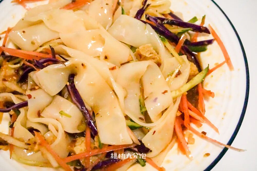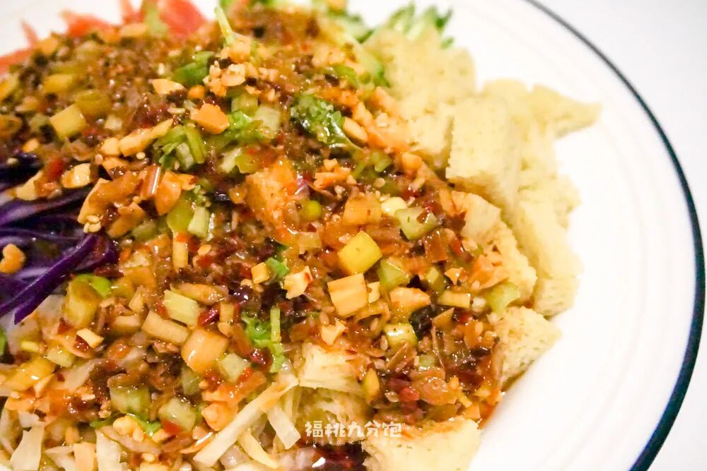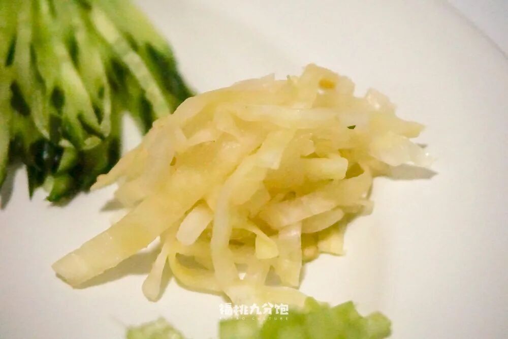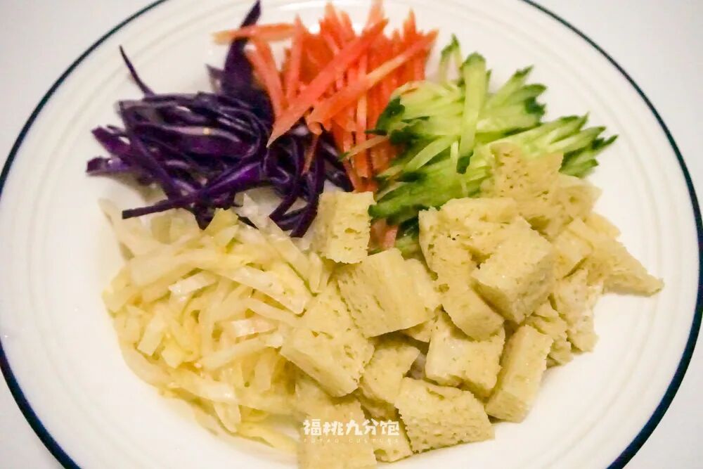 凉皮的制作方式相信大家已经烂熟于心了,饱妹不做赘述,直接划重点。一是在配菜,二是在酱料。