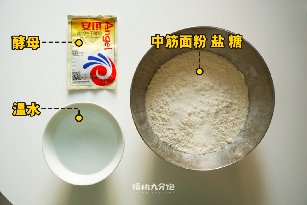制作戗面馒头的材料很简单,下面配料中为4-5个馒头的量。