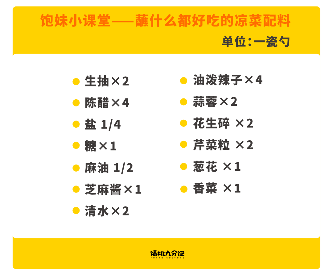 做饭刚入门时的饱妹,最害怕的就是适量二字,所以这张配料表的计量单位为家家户户都有的瓷勺。记好下面这张调料表,拌什么凉菜都好吃。