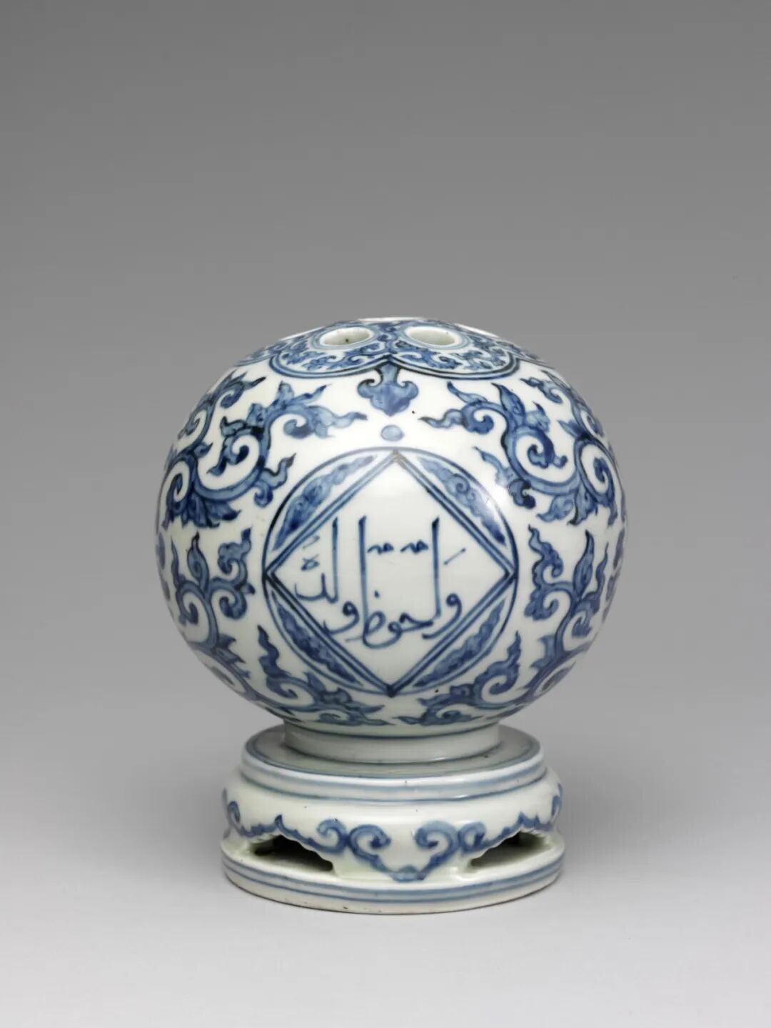 ▲明正德青花瓷阿拉伯文七孔花插 台北故宫博物院藏。