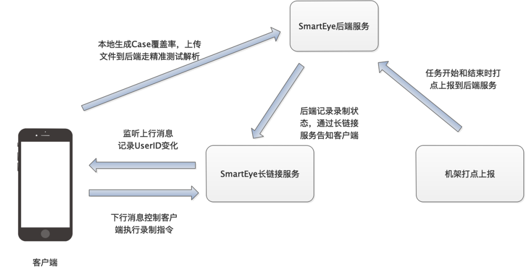 自动化用例录制全流程无人工干预,录制时需要以单个用例为分割,记录单条用例的代码覆盖率数据和用例的关联关系。SmartEye结合客户端高级调试模式SDK,使用公司基础长链接服务控制自动机架的指定设备进行用例数据的录制/停止,全流程自动化,可以以很小的成本,批量录制客户端自动化用例。