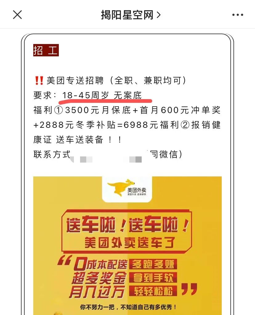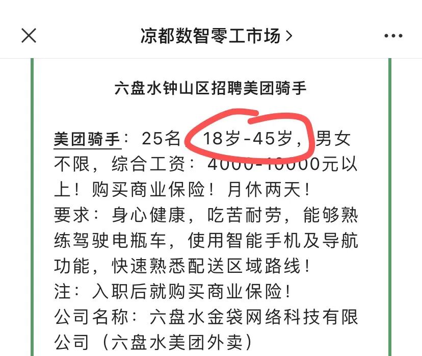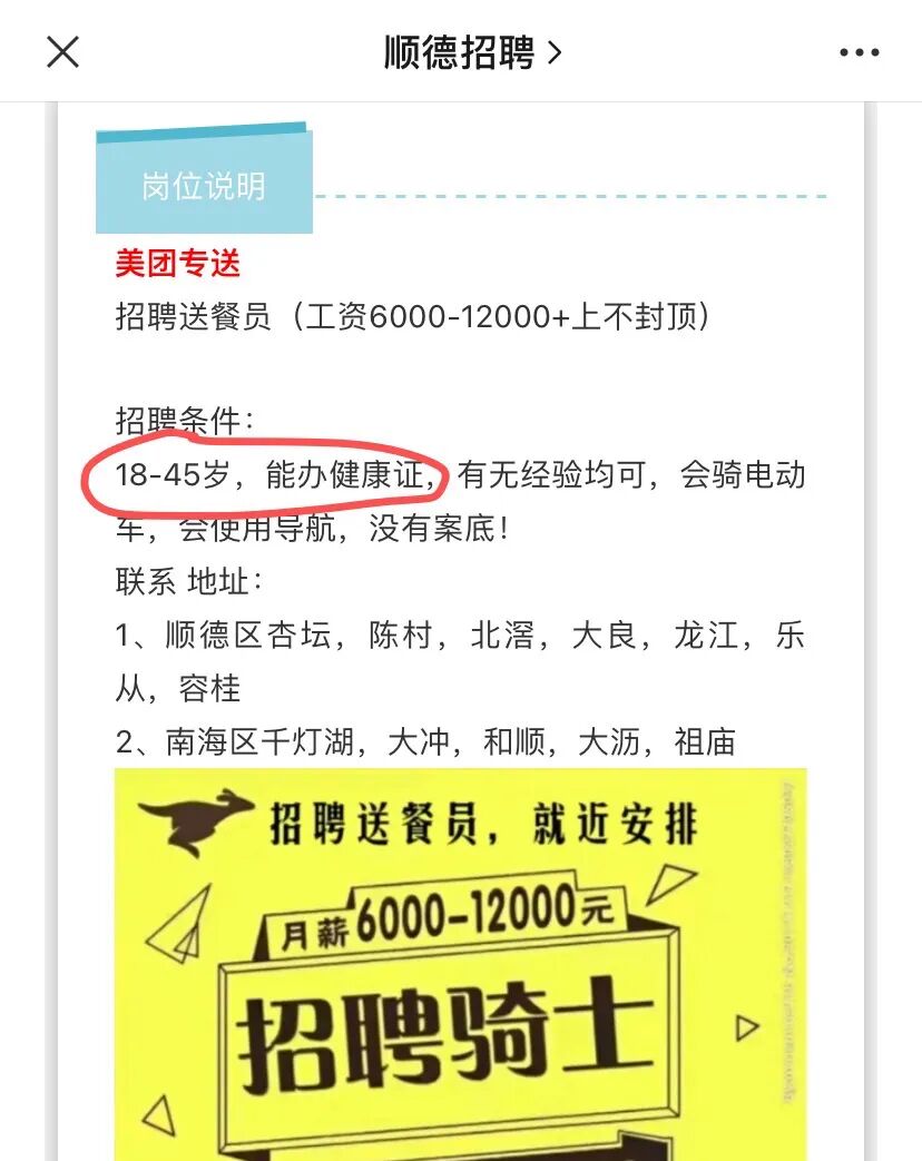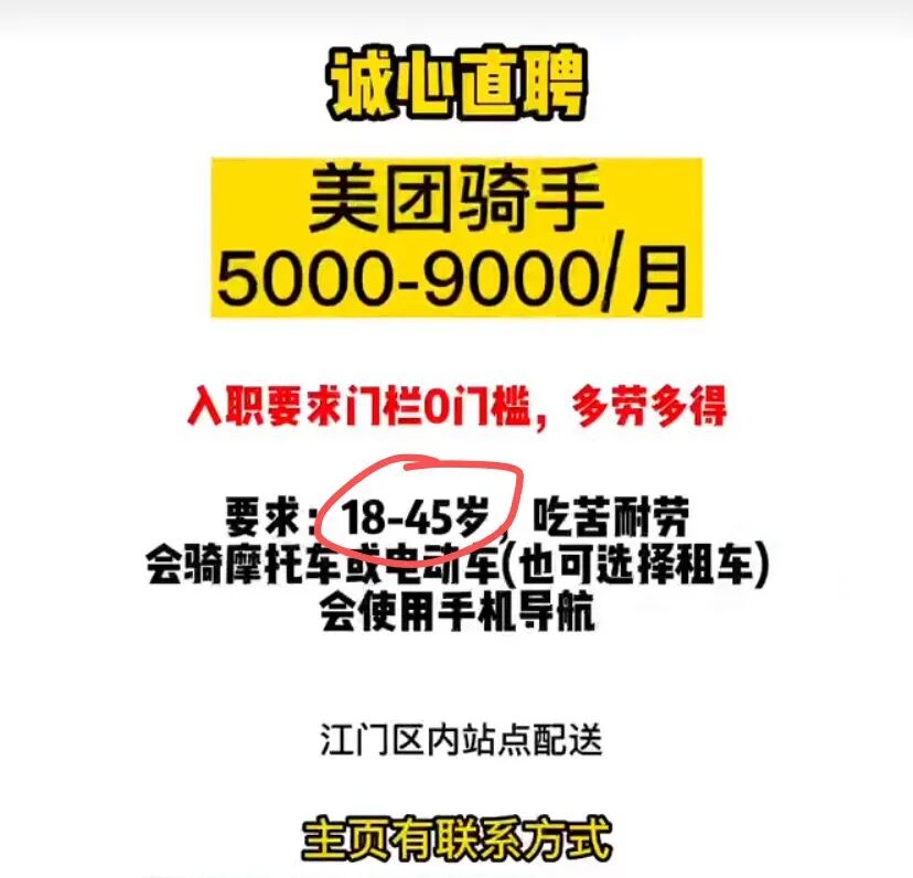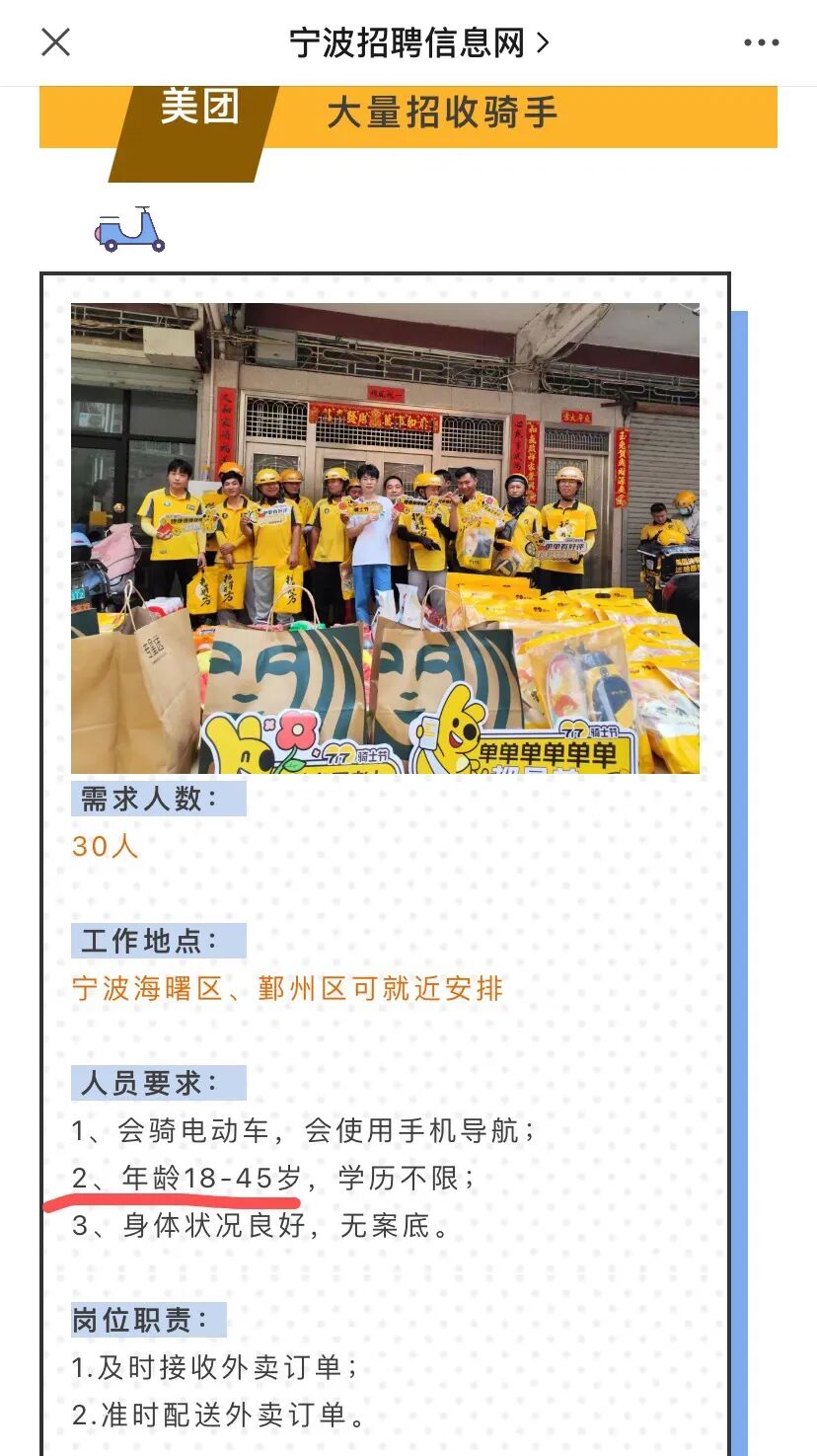 比如包邮区宁波的美团骑手招聘,明确限定18到45岁。